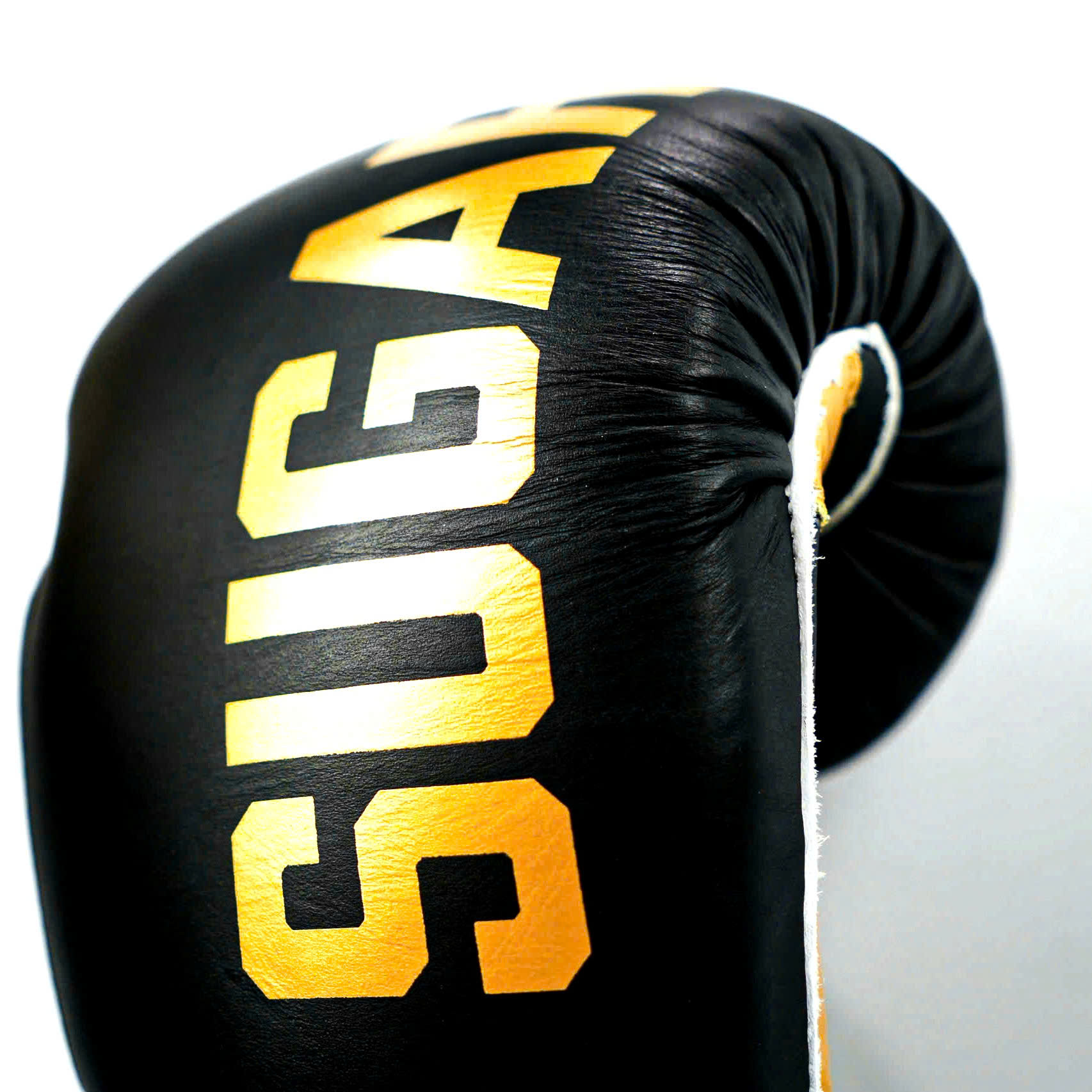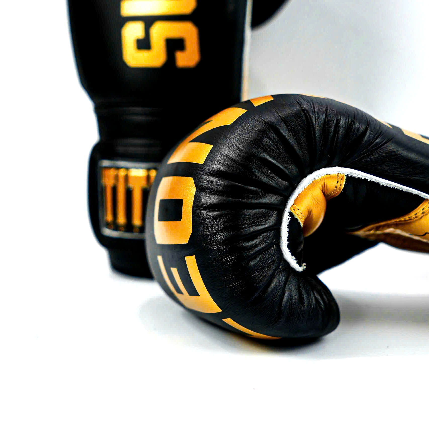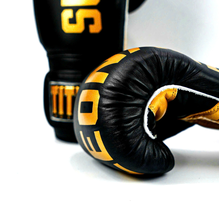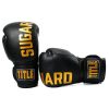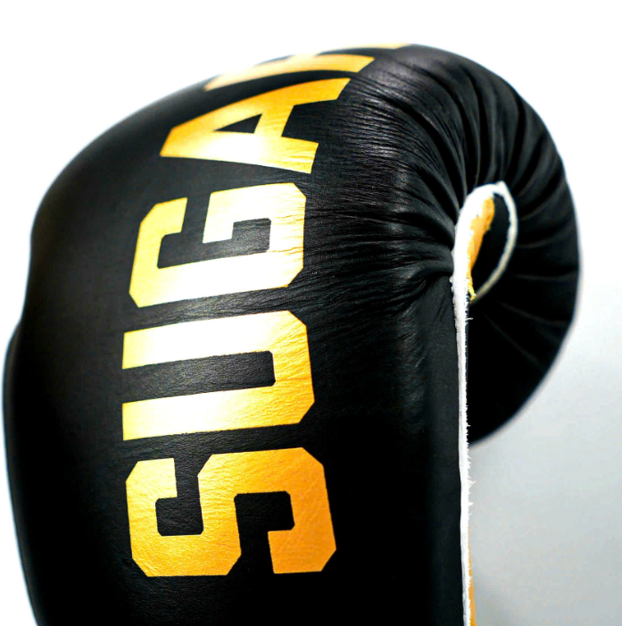 Điểm gây ấn tượng mạnh nhất chính là thiết kế màu đen huyền bí kết hợp chữ vàng ánh kim nổi bật. Trên bề mặt găng, dòng chữ “SUGAR”“LEONARD” được in lớn, tạo cảm giác mạnh mẽ và cá tính, khẳng định phong cách của võ sĩ huyền thoại. Logo TITLE Boxing được đặt trên khóa cổ tay, càng tăng thêm sự uy tín và giá trị thương hiệu.